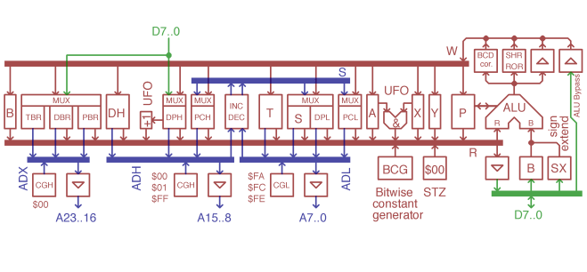 The C75-6502’s internal bus structure is fairly straight forward — there are two main buses (shown in red above): the W-BUS is used to write to all registers, and the R-BUS to read from them. The ALU takes register values on the R-BUS, together with external values from memory (via the Data Bus D7..0), and outputs its results to the W-BUS, ready to be written back to the registers. The internal address buses (ADL, ADH and ADX shown in blue above) take their input from internal address registers, and output to the external address bus (A0..A23). Finally, the S-BUS (also shown in blue above) receives the output of a 16-bit address incrementer (INC/DEC above) for address handling. The incrementer takes its input from the internal address bus, ADL/ADH.